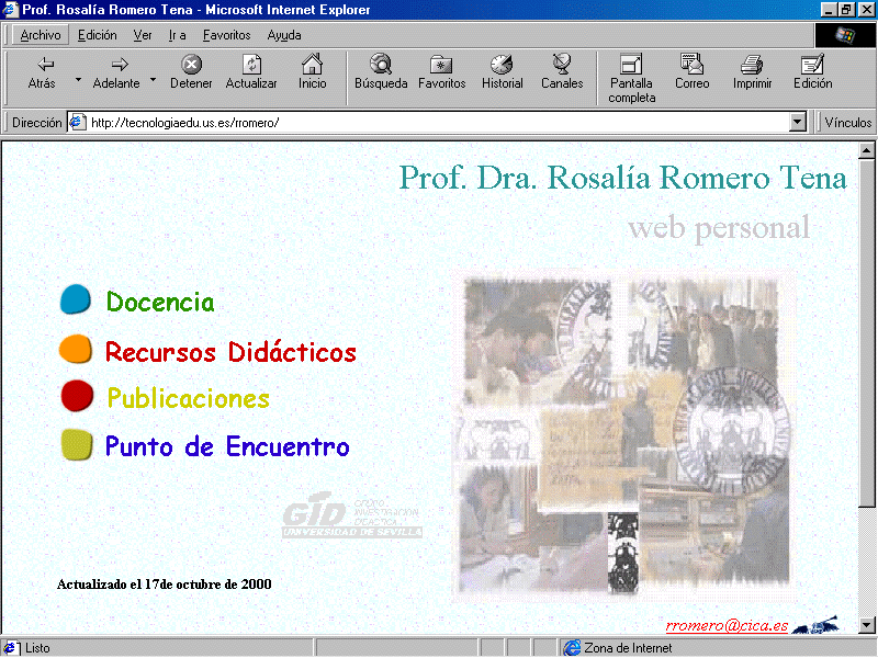 El curso me ofreció múltiples y variadas ideas para realizar la página personal con el objetivo de ofrecer a mi alumnado unas directrices determinadas, un servicio más flexible, una información más amplia, en definitiva un acercamiento más personalizado y comunicativo no sólo conmigo sino con sus propios compañeros. Es conveniente decir que la página está dirigida a los alumnos de Nuevas Tecnologías de la Facultad de Ciencias de la Educación de la Universidad de Sevilla, también puede ser útil para ciertos temas de Tecnología Educativa y para todas aquellas personas interesadas en conocer contenidos relacionados con esta temática.