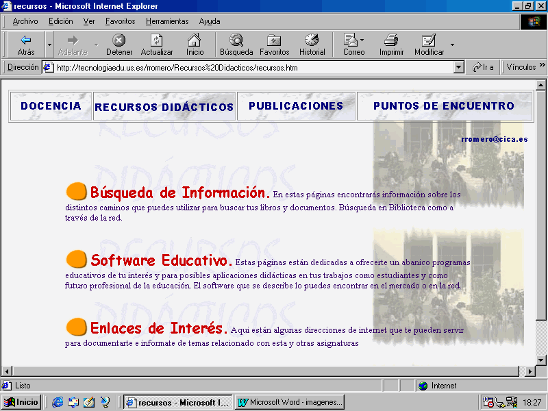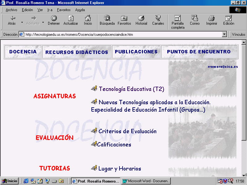 B.- DOCENCIA: Esta parte de la web se centra fundamentalmente en la orientación e información del alumnado perteneciente a las asignaturas de Tecnología Educativa del curso de 3º de la Licenciatura de Ciencias de la Educación (Plan 98/99), y de Nuevas Tecnologías Aplicadas a la Educación de la Diplomatura de Maestro(Educación Infantil). La página contiene tres apartados el primero ofrece los objetivos y contenidos de cada una de las asignaturas (programa). El segundo aporta datos sobre los criterios de evaluación de dichas asignaturas y en su momento ofrecerá las calificaciones de los exámenes, trabajos etc.. y por último tenemos el horario de tutoría.