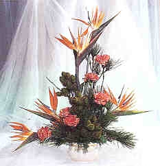 Strelitzia com Cravos no cachepot, frente única, tamanho médio.
