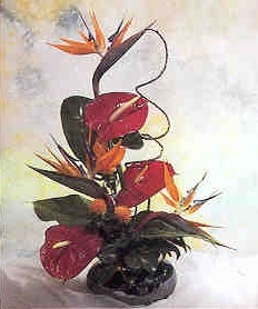 Strelitzias e Anthuriuns com folhagens diversas no cachepot, frente única, tamanho médio.