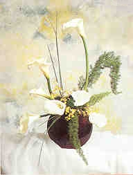 Copos-de-Leite com Oncidiuns e folhagens diversas no cachepot, frente única, tamanho médio.