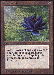 Comentário:Black Lotus A Black Lotus é atualmente a carta mais rara e mais cara de todo o Magic. Seu preço é avaliado entre $325 e $400. Ela é tão cara por causa da sua edição, que já não é mais vendida publicamente e também por causa dos seus combos, que são excelentes.O combo mais famoso é : montanha, bola de fogo, canal e black lotus. Esse golpe mata o oponente no primeiro turno.Atualmente no Brasil, existem 49 black lotus. E, no mundo todo existem milhares!!Mesmo assim, ela é uma das carta mais procuradas (se não for a mais) de Magic no mundo. Características: Custo:Ø ; Artefato Lendário ; Sacrifique Black Lotus, adiciona 3 mandas de uma cor que você possa adicionar, use essa habilidade com uma mágica de interrupção. |