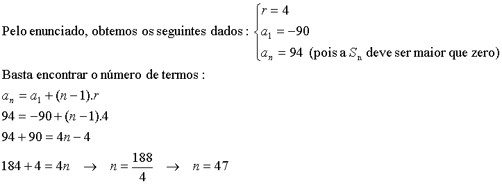 7) Se Sn é a soma dos n primeiros termos da progressão aritmética (-90,-86,-82,...) então o menor valor de n para que se tenha Sn>0 é: