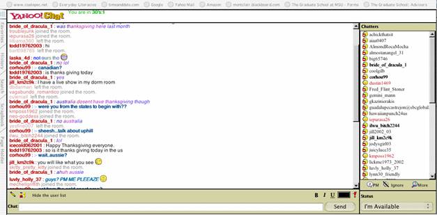 Internet Relay Chat (“Chat”) is the longest running and probably the best-known synchronous communication application. It involves dedicated web spaces and purpose-built interfaces that enable “chatters” to register with a chat service and converse with each other by keying texts into the chat software system (see Figure 4).