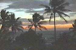 Blick vom Strand auf den Seeschlangenfelsen (nur Mythen!) mit Tempel. An diesem Strand kann man gut baden, schnorcheln, abends Teufelsaustreibungen miterleben, allerdings sollte man zu den vielen Rauschgiftabhängigen Abstand halten. Weniger schlimm sind die heiligen Kühe die dort den Strand zwischen den Liegestühlen mit Bikinischönheiten bevölkern. | ||
