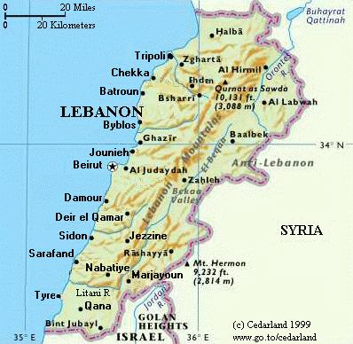 Lebanon, location: Middle East, bordering the Eastern Mediterranean Sea, between Israel and Syria. Geographic coordinates: 33 50 N, 35 50 E
