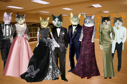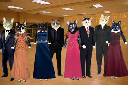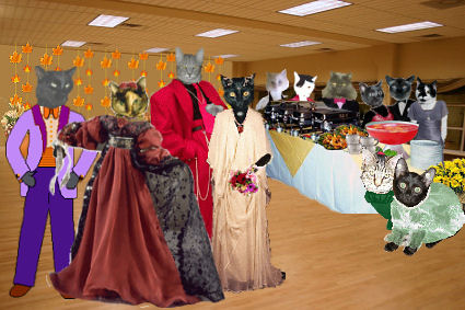 The kitties enjoy the buffet of fried shrimp, crab cakes, and prime rib sammiches.
