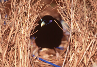 | The Satin Bowerbird is one of the strange things of the universe. Inhabiting the cool mountain forests of eastern Australia, this beautiful species (Ptilonorhynchus violaceus) is a member of the family Paradisaeidae, bowerbirds and birds of paradise. Mr. Satin is the glossiest black imaginable, with iridescent highlights of blue and purple. Mrs. Satin, more modest, is clothed in modish green, scaled with subtle bronze markings. Both have eyes the color of Kanchanaburi sapphire. Their beauty, however, is not what makes them strange. Mr. Satin has a passion, and that passion is for all things blue. This passion gets him into trouble, so in his homeland, he is called by the locals "Jock the Thief." As a bowerbird, Jock lures females in for breeding by constructing a bower, or "love-nest hut." Jock contructs his bower with great care, weaving twigs and grasses into a narrow, arching avenue, fronted by a wide, flat apron. Females are attracted to the bower, where he mates with every one he can attract. Each female departs to raise her young alone, leaving Jock to maintain the splendor of the bower. Every day Jock patrols his bower, weaving and straightening, adding and tidying. But his bower MUST be decorated with blue, especially on the apron. Every day, Jock goes in search of more blue objects for the apron of his bower. Before the advent of man, Jock collected blue parrot feathers, blue blossoms and berries, and the odd bluish pebble to display on his apron. Flowers wither, feathers fade, and berries rot or are eaten by other creatures. To keep his blues, Jock would have to work every day to weed out the faded blue things and bring in fresh, bright blues. People, however, make blue things, and they leave them out where Jock can see them. Jock, being a bright fellow, seizes every opportunity. |