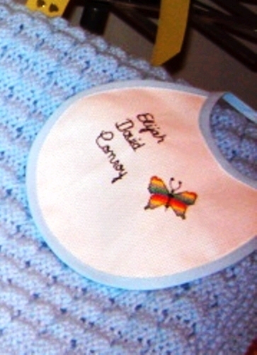 | This is the bib my mom made and the blanket my grandma made for Elijah. | |||||||||||||||||