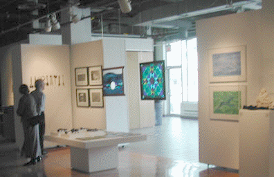 ![]() wide view including (l to r) Ann Catrin's love 'weapons' Ruth Skinner's photography, Brigitte Wolf's stained glass, Karin Wells' paintings and Laura Travis' stone carving |