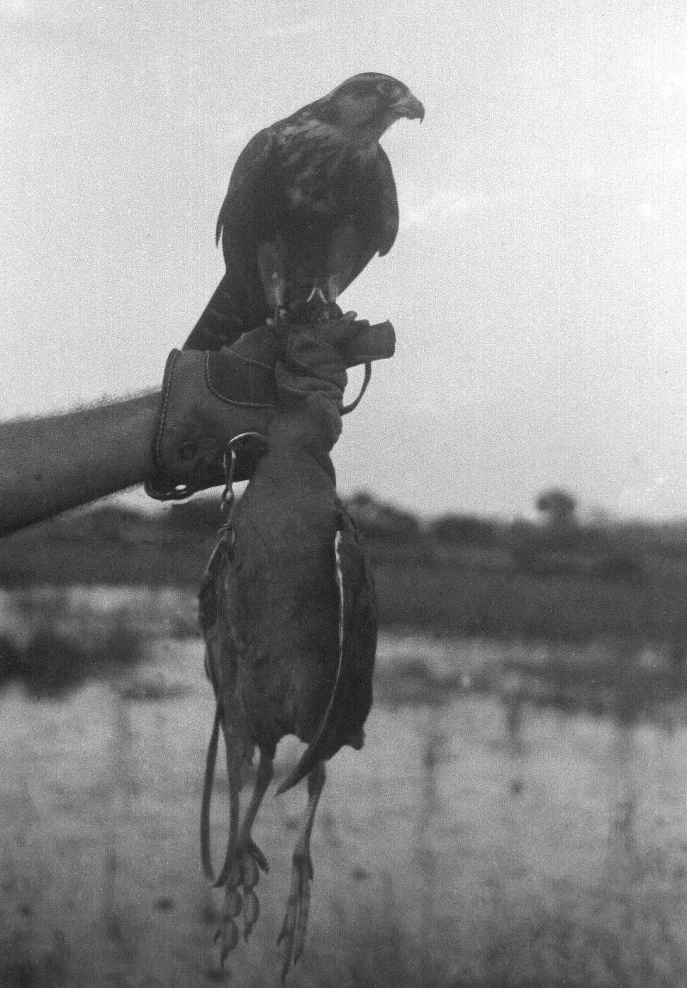 Salimos como a las 6:00 de la mañana, mi amigo Edgar Rubalcaba y yo caminamos cerca de una hora entre potreros, maleza y prados, hasta que localizamos a dos aplomados inmaduros, un macho y una hembra, colocamos la trampa y el macho sin pensarlo 2 veces se arrojo a la trampa imediatamente, callo en ella. Acudi rapido al lugar tome al macho y lo encaperuze, lo armamos y lo pare en el guante, despues nos transladamos a casa muy contentos. dio un peso de 270gr. y lo tuve todo el día en el guante se mostraba muy nervioso y se devatia, asi estuvo hasta las 11:00 de la noche que lo deje descansar, al dia siguiente lo tome muy temprano, como a las 9:00 de la mañana, coloque un gorrion vivo en sus patas, el halcon lo picoteo y al escuchar el chillido de el gorrion lo tomo con una de sus patas imediatamente, lo mato con el pico y comenzo a comer, por supuesto yo hacia el clasico chasqueo, por la tarde le estuve dando picadas, tocandole las patas, al dia siguiente repeti la misma operacion y regresamos al Edo. de México.
