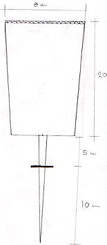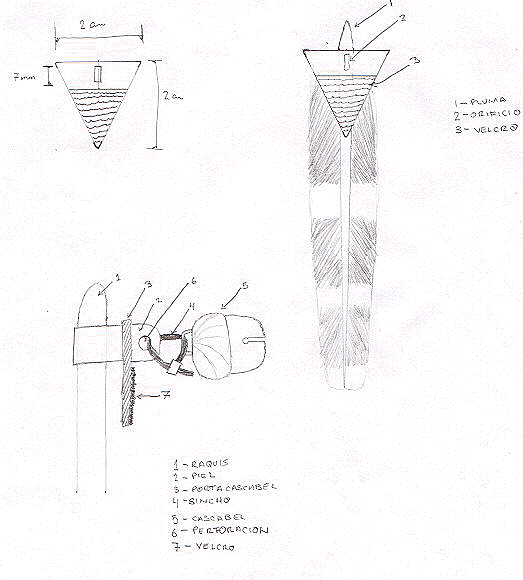 Este se coloca en un porta-cascabel, para evitar que este se gire entre las plumas, este porta-cascabel tiene doble utilidad ya que se usa para sujetar el protector de la cola. Podemos fabricar el porta-cascabel con una tarjeta telefónica, este no es mas que un simple triángulo (ver dibujo 3).