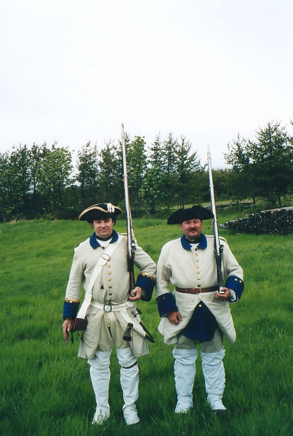 La compagnie que personnifie les membres des miliciens et réguliers est celle des grenadiers, ayant occupé le dernier fort français en Nouvelle-France de 1759 à 1760. Le Fort Jacques-Cartier est situé aux abords de la rivière du même nom tous près de Donnacona dans la région de Portneuf. Nos grenadiers portent un collet, autre distinctive des troupes de terre, par rapport à leurs homologues de la Marine. Les collets ne font pas parti de l'ordonnance pour les troupes de terres envoyées au départ pour protéger la colonie, mais font leur apparition graduellement avec les années; en effet, les uniformes donnés aux soldats sont renouvlés normalement à chaque année, et ils sont de la responsabilité du soldat d'en faire l'entretien.