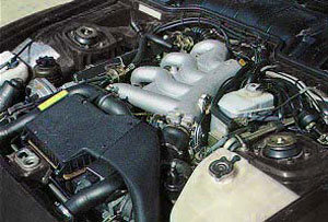 quatre/huit-cylindres refroidis par eau. Ce bloc était à simples arbres à cames en tête, avec deux soupapes par cylindre. Il était doté d'une injection électronique Bosch L-Jetronic et d'un système de gestion Motronic fabriqué par ce même fournisseur allemand. Afin d'éliminer les phénomènes vibratoires, ce quatre-cylindres de grosse cylindrée disposait de deux arbres d'équilibrage contretournants. |
