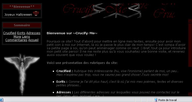 Bon oki ça devient un peu mort depuis quelques semaines... Mais c'est parce que j'ai commencé à bosser et pis que j'ai plus vraiment le temps, mais ça devrait s'arranger gentiment... Vous faîtes pas de souci.. Pour ce qui concerne le nouveau layout, il faudra attendre encore un peu.. Parce que geocities accepte pas le php, et donc faudrait que je change de serveur, et c'est tout un bordel, donc ça attendra!
