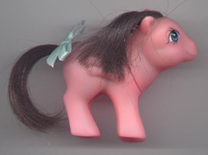 You find yourself ducking as a pink blur passes close by your head. It lands, revealing itself to be a playful baby pegasus with deep brown hair. "Baby Interview!" Pumpkin scolds, standing on tiptoes in an attempt to look bigger and more important than the other baby. "I've told you -- watch where you're flying! You almost smashed right into our visitor." Baby Interview looks up at you and giggles. "I'm sorry. Next time I won't miss, I promise." She winks, then flaps her tiny wings and takes off again. Within seconds she is gone. You remark that Baby Interview looks remarkably like a real baby pony. "Yes," Pumpkin agrees. "In fact, she is in the same mold as, say, Baby Firefly. But she's not a Hasbro pony. It's quite strange. "Oh, and another thing about Baby Interview. Her mane is normal, but her tail..." Pumpkin begins to whisper. "It's human hair, you know. Really. And her name comes from a vampire movie. Minty can get a little morbid sometimes. "Now, speaking of babies in MLP molds, let me introduce you to..."