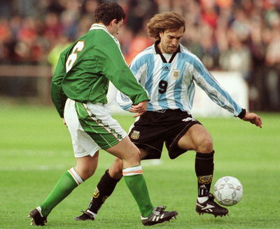 Batistuta e Ian Harte aparecen en esta escena del partido jugado en Dublin el 22 de abril. Este terminó 2-0 a favor de los albicelestes. Fue parte de la preparación de la selección argentina para el mundial de Francia '98. |