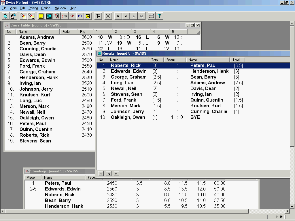 - Swiss Perfect Es un programa bastante conocido, aunque no es gratis. Es sencillo de utilizar. http://www.swissperfect.com/ Un ejemplo de torneo organizado con Swiss