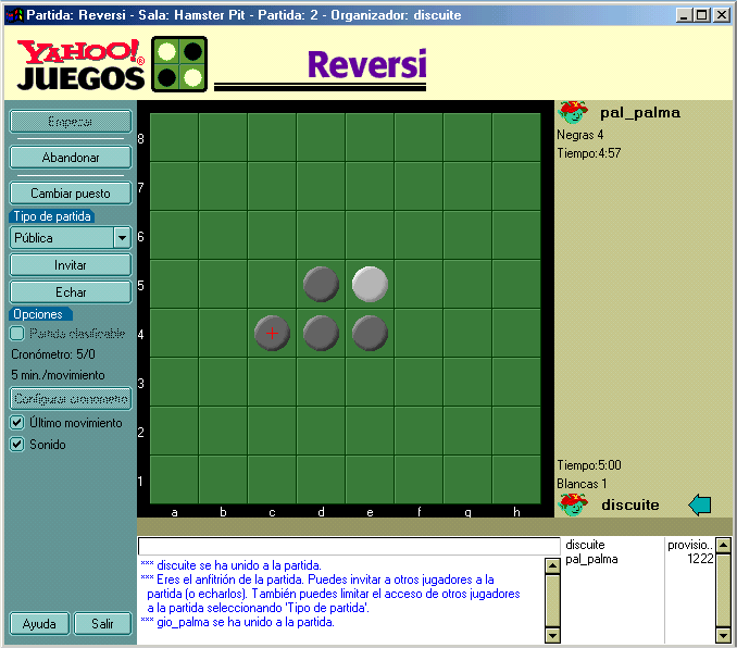 Comentarios: Aunque lo valore peor que el de Yahoo, en un ordenador modesto funciona mejor. Acceso: Primero, registrarse. Luego hay que bajar un programa de un par de megas. Cada vez que se entre, se ejecutarán un par de aplicaciones (por ejemplo, el "Zone Friends"), tardando unos segundos. Características positivas: - Alto número de jugadores. - En la sala Grotto suele haber casi siempre unos cuantos jugadores hispanohablantes. Características negativas: - No se puede hacer una transcripción de la partida. - No guarda una base de datos. - Opciones muy escasas. - No está en español. Precio: Gratis. Otras características: Se puede acceder a este servidor como "guest", es decir, como visitante anónimo que no puede chatear. Los gráficos y el modo de juego son los mismos que cuando se juega con el reversi para jugar en línea que se adjunta en las últimas versiones de Windows. Tampoco se puede en este caso hablar, pero sí poner mensajes predeterminados. |