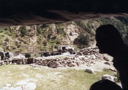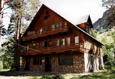 17:30 H Llegamos al pueblo de Vierkhni Baksan, donde dejamos la fur- goneta y nos traslada el mafioso a un antiguo camión militar de transporte de tropas, aun pintado de verde. Pasamos por un control militar y una base llena de cañones y camiones, a través de una pista forestal que nos lleva hasta una especie de ascensor gigante. Se nos acerca un soldado y nos pide tabaco, se lo damos; se vuelve a acercar con la pretensión de cambiar una bala por mas tabaco, le damos el tabaco; no aceptamos la bala. El ascensor gigante (sin paredes) eleva el camión 200 metros, hasta llegar a un descampado donde continua la pista forestal. Esa pista,tras mucho traqueteo, nos traslada hasta un refugio forestal (2.300 m.) llamado Jailyk, en el valle de Adyrsu, junto a un campamento que antes solo tenían permitido utilizar los escaladores rusos y que ahora esta abierto a todo el público (previo pago). El valle está coronado por la impresionante mole del pico Ullutau ( 4.207 m. ), del que toman nombre el campamento y nuestra agencia de viajes. En el comedor de ese campamento nos vuelven a dar tomate y pepino, aunque el segundo plato es algo similar a la carne. En un pequeño y oscuro bar venden bebidas alcohólicas de todo tipo, pero el agua es únicamente con gas, de los manantiales de Minerali Vody, mundialmente conocidos.