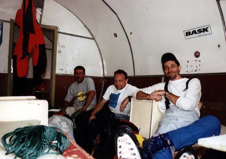 Descendemos del telesilla, los refugios se encuentran a solo 100 m. de distancia. Son una enormes construcciones cilíndricas (toneles), que descansan sobre su panza y a las que les han practicado unos agu- jeros donde han colocado puertas y ventanas; son de tamaño similar a las cubas de los camiones de la CAMPSA. Nos tememos lo peor, pero nos llevamos una grata sorpresa al entrar en ellos, solo permiten 5 personas por barrel y su interior es confortable, con 5 camas (sábanas y mantas inmundas, eso si) y espacio suficiente para vivir en ellos con un mínimo de comodidades. Son las 12:00 y la agencia de viajes nos sorprende con la noticia de que ha puesto una cocinera a nuestra disposición ( solo para las comidas, se entiende ). Biera se llama, una preciosa caucasiana, hiperfemenina y tímida que, con gran pericia, se desvive durante 3 días para que podamos disfrutar de unos alimentos elaborados con esmero. Desayuno, comida y cena es un lujo del que solo disfrutamos los españoles que nos encontramos allí... americanos, rusos y otros pelajes se han de preparar ellos mismos la pitanza a la intemperie mientras nosotros ocupamos un barracón entero a la hora de las comidas; si a eso añadimos los 2 kgs. de jamón Ibérico que se ha traído Fermín, se entenderá que, comparativamente, estuviéramos en la gloria.
