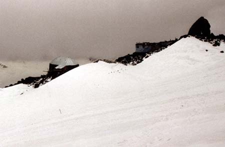10:00 Salimos del hotel con destino al teleférico que nos llevará a los refugios llamados "Barrels". Nos han contado historias para no dormir sobre ese teleférico, su funcionamiento y estado de conserva- ción... pero, ya se sabe, las leyendas urbanas poco o nada tienen que ver con la pura y dura realidad. Unos minutos de espera para recibir a tan arcaico aparato; parece aterrizar entre ruidos a lata apunto de caer hecha añicos mientras crujen los cables que lo sustentan... la apertura automática de la puerta la realiza, diligentemente, eso si, un operario a base de desencajarla de los goznes para que pueda moverse. Nos miramos en silencio mientras entramos en él, el suelo esta desconchado y la lata levantada, pero el aparato parece funcionar. La posible sensación aérea la mitiga el lamentable estado de los vidrios que, gracias a la roña acumulada, poco dejan ver de los precipicios que nos rodean. Descendemos en un moderno edificio (sic) que se encuentra a 1,5 kms. de distancia; tomamos un nuevo teleférico, tan antiguo y cochambroso como el anterior. Estamos en la cota 3.350 y nos espera la última sensación del día, un alucinante telesilla mas anciano que los teleféricos... esta vez la distancia a cubrir es mayor; con las mochilas a cuestas nos sumergimos en un mundo de helado silencio que nos lleva, poco a poco, hasta los 3.800 m. de altitud. Nuestro destino los Barrels, ¿porque se llamarán así?.