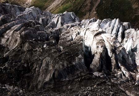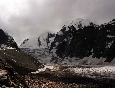 Al poco damos con el primer circo, donde se acumulan ingentes cantida- des de hielo procedentes del circo del pico Volnaya Ispania (España libre), que se encuentra mas arriba. El hielo se arremolina en enormes bloques que crujen sonoramente, y todo ello aderezado con el Ullukara