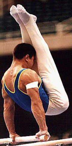 | Un ejercicio de paralelas consiste básicamente en elementos de balanceo y vuelo. Componentes de fuerza pueden ser empleados en la rutina, aunque no son necesarios.