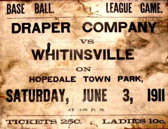 | In the photo at the top, a horse can be seen helping to construct the baseball diamond. The date of the picture is unknown but it was no earler than 1906 because that is when the bandstand was errected. The icehouse is visible on the far side of the pond. Thanks to Bill Creasia for the donation of the poster shown in the bottom picture. Park, Pond and Sports Menu Short Stories Menu Icehouse HOME |
