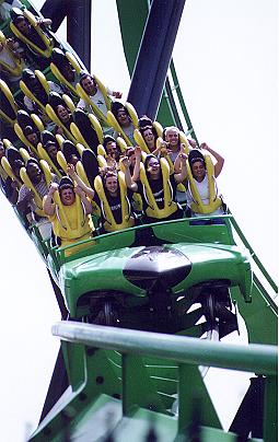 The "JOKER" ride. A standing roller-coaster with a huge dip, 4 loops and a cock-screw. Incredible rush! We voted this the best Coaster ride among all the rides we took at all the theme parks we visited!