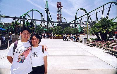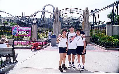 Outside Gotham City and the Batman ride. Another very thrilling Coaster with riders legs hanging out and the cars suspended from the rails instead of sitting on them.