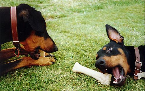 Gnawing on their nylabones. Rare moment where Janus lets Oscar chew on his own bone.