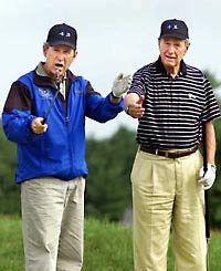 President Bush celebrated his 55th birthday on Friday, treating himself to a round of golf during an extended holiday break. The president was also accompanied by his father George, former US president, and his brother Jeb, Governor of Florida. The trio played at a course which lies in Kennebunkport, Maine, not far from the Bush family compound.
