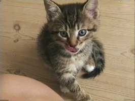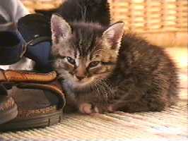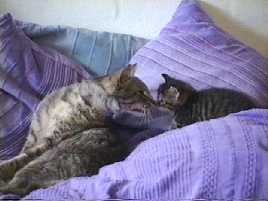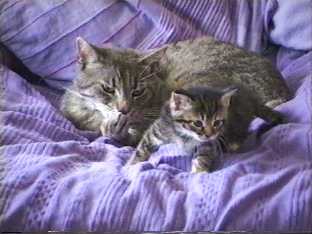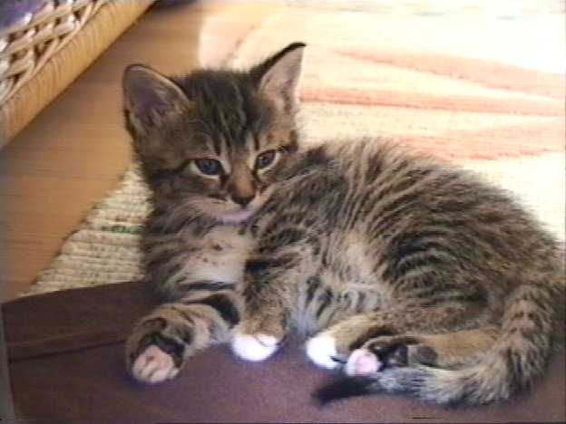 Dieser `Tiger´ läßt sich am einfachsten dadurch von dem anderen Tiger unterscheiden, daß nur die Spitzen seiner hinteren Pfoten weiß sind, wogegen bei dem anderen Kätzchen fast die ganzen hinteren Pfoten weiß sind.