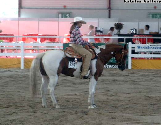 Charakter: Pila ist eine ausgesprochen treue, ausdauernde Westernstute. Sie ist ein Traum für jeden fortgeschrittenen Westernreiter, da sie sehr ehrgeizig, schnell und wendig ist, dabei aber absolut zuverlässig. Sie hat schon einige Westerntuniererfolge, vor allem im Trail. Nebenbei ist sie eine tolle Gefährtin fürs Gelände und hat auch den nötigen "Cow Sense". Ihr Fohlen Tommy ist süß, aufgeweckt und kräftig. Bei den Eltern wird er bestimmt ein Prachtkerl.