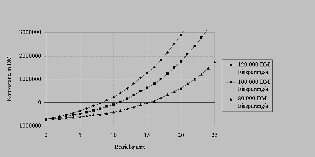 Die innerhalb eines Betriebsjahres anfallenden Instandhaltungs- und Betriebskosten und die Zinsen der Schuldenlast werden von den jährlichen Einsparungen abgezogen. Der verbleibende Restbetrag wird zur Tilgung der Schulden verwendet. Dabei muß der Einfluß von der Strompreisentwicklung, der Zinsen und der Instandhaltungskosten mit berücksichtigt werden.
