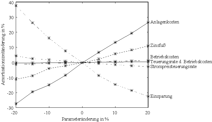 Der Nullpunkt dieses Diagramms repräsentiert die Berechnung der Amortisationszeit mit den oben angegebenen Werten und einer jährlichen Einsparung von 100.000 DM. Bei den nachfolgenden Berechnungen wurde jeweils ein Parameter der Gleichung (76) in 5%-Schritten variiert, während die anderen Parameter konstant gehalten wurden. Aus dem Diagramm geht deutlich hervor, daß die maßgeblichen Parameter die Anlagenkosten und die jährlichen Einsparungen sind. Weiterhin ist der Einfluß des Zinsfußes und der Strompreisteuerungsrate nicht vernachlässigbar. Die festen Betriebskosten und ihre Teuerungsrate sind unbedeutend für die Berechnung der Amortisationszeit.