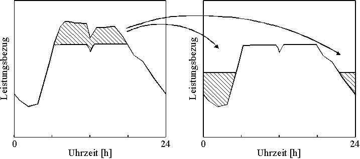 Ein tageszeitlicher Ausgleich wird über eine veränderte Fahrweise von Anlagen und Maschinen erreicht. Es werden regelrechte Fahrpläne aufgestellt und Fertigungs- und Herstellungsprozesse in Zeiten mit niedrigen Arbeits- und Leistungspreisen verlagert, wenn dies mit dem Betriebsablauf einigermaßen in Einklang zu bringen ist. Diese Fahrplanänderung wird zum Beispiel bei Gießereien erfolgreich angewandt, wo die Einschmelzperioden der Elektroöfen in lastarmen Zeiten durchgeführt werden. In die Fahrplanänderung können auch eine betriebsinterne Stromerzeugung oder die Entnahme von Energie aus in Schwachlastzeiten aufgeladenen Speichern einbezogen werden. Für diesen Zweck müßten die Speicher einen hohen Energieinhalt und geringe Umwandlungs- und Speicherverluste bei Speicherzeiten um die 10 Stunden besitzen.