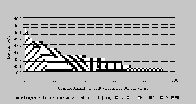 In Bild 24 ist der obere Teil von einem Lastfolgeprofil eines Industriebetriebes für einen Monat beispielhaft gezeigt. Die Meßperiode betrug 15 min. Die Leistungsspitze dieses Monats lag bei 46,2 MW. Es gab in diesem Monat fünf Überschreitungen über die 45,9 MW-Grenze für die Dauer von einer Meßperiode. Legt man die gedachte Lastgrenze um 200 kW niedriger, gab es sechs Überschreitungen von einer Periodendauer, eine Überschreitung für die Dauer von zwei Meßperioden und zwei Überschreitungen für die Dauer von drei Meßperioden.