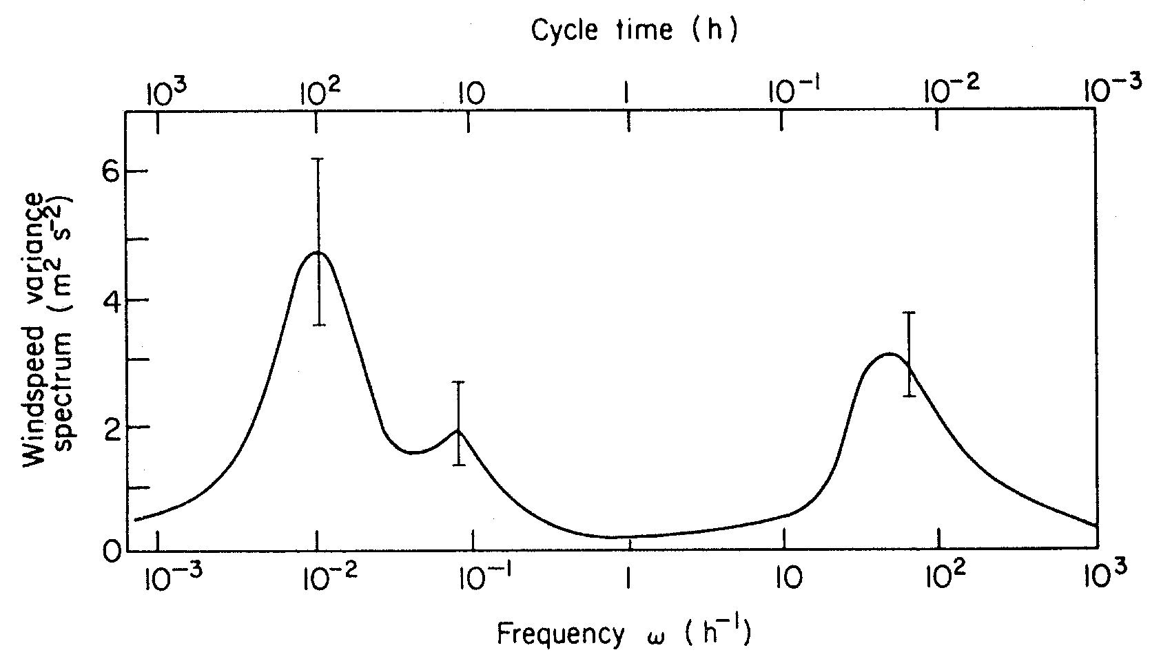 Bild 25: Windgeschwindigkeitsvarianzspektrum in einer Höhe von 100 m, basierend auf Messungen von Van der Hoven (1957) (nach [36])