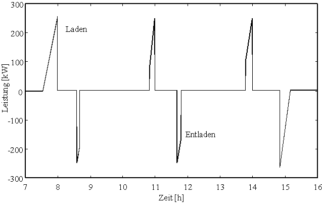 Am Anfang des Zyklus steht der Aufladevorgang der Anlage bis zum maximalen Energieinhalt. In der Zeit bis zur Frühstückspause wird das Schwungrad einmal kurz zum Abdecken einer Lastspitze teilentladen. Da die nächste Lastspitze erst um die Mittagszeit zu erwarten ist, wird das Schwungrad erst kurz vor 11 Uhr wieder voll aufgeladen. Es folgt eine weitere Entladung und Aufladung, bis schließlich die Lastspitze gegen 15 Uhr abgedeckt und das Schwungrad komplett entladen wird. Dieser Lastzyklus wiederholt sich an jedem Arbeitstag und ist als durchschnittliche Belastung anzusehen, die in gewissen Grenzen von Tag zu Tag variiert.