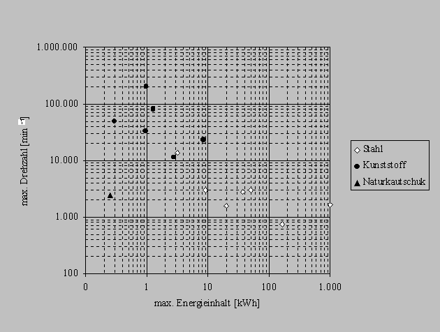 Um einen Überblick über die Schwungradentwicklung zu gewinnen, sind die Tabellen 6a und 6b (siehe Anhang 12.1) erstellt worden. In diesen Tabellen sind die Merkmale und Daten der oben erwähnten Schwungradenergiespeicheranlagen in chronologischer Reihenfolge aufgeführt. In der folgenden Darstellung ist die maximale Drehzahl über dem maximalen Energieinhalt in Abhängigkeit der verschiedenen Schwungradwerkstoffe aufgetragen.