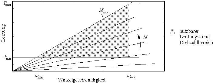 Die strahlenförmig auseinandergehenden Geraden geben den linearen Zusammenhang zwischen Leistung und Winkelgeschwindigkeit nach Gleichung (9) mit dem Moment als Parameter wieder. Die größte mögliche Steigung ist demnach bei maximalen Moment gegeben. Soll das Schwungrad im Arbeitsbereich stets eine Mindestleistung zu Verfügung stellen können, so muß die Drehzahl auch nach unten begrenzt werden. Die Grenze ergibt sich aus dem Quotienten aus der Mindestleistung und dem maximal zulässigen Moment.