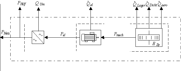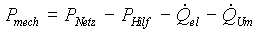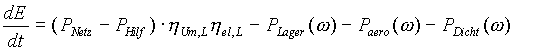 Im elektrischen Anlagenteil wird beim Laden die aus dem Drehstromnetz entnommene elektrische Leistung PNetz in die mechanische Leistung der Schwungradwelle umgewandelt. Zuerst wird die Versorgungsleistung der Hilfsaggregate von der Netzleistung abgeführt. Die Umwandlung der Netzleistung in die mechanische Wellenleistung ist verlustbehaftet, und der Leistungsfluß kann aus einer Leistungsbilanz um die elektrische Maschine und den Umrichter erhalten werden: