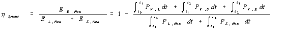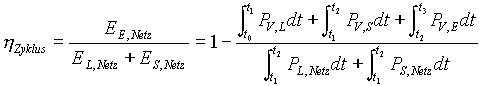 Schließlich läßt sich formal auch noch ein Zykluswirkungsgrad aufstellen, in dem die zum Ende des Zyklus an das Netz abgegebene elektrische Energie EE,Netz ins Verhältnis zur der während des gesamten Zyklus von Netz aufgenommenen Energie EL,Netz + ES,Netz gesetzt wird.
