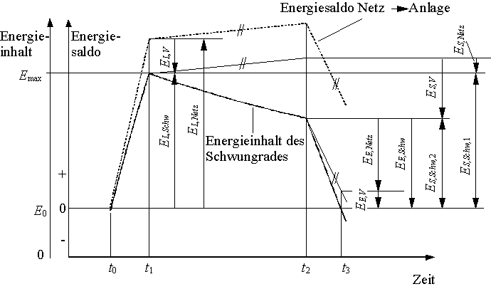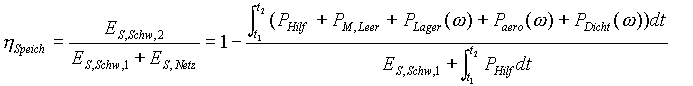 Während der Speicherung wird das Schwungrad durch die Reibung im mechanischen Anlagenteil abgebremst. Dabei kommt die Leerlaufverlustleistung der Maschine PM,Leer als zusätzliche Verlustleistung in der Bilanz hinzu. Es fließt keine elektrische Energie vom Netz in das Schwungrad. Trotzdem wird die zur Versorgung der Hilfsaggregate notwendige Leistung PHilf aus dem Netz entnommen, und der Energiesaldo steigt. Die zum Zeitpunkt t2 übriggebliebene Rotationsenergie ES,Schw,2 ist als Nutzen und die zum Zeitpunkt t1 im Schwungrad eingespeicherte Energie zuzüglich der aus dem Netz entnommenen Energie ES,Netz ist als Aufwand anzusehen: