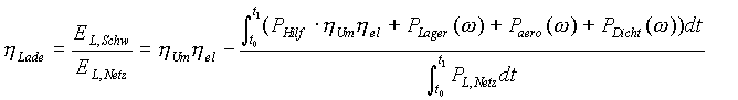 Beim Ladevorgang ist der Nutzen die Zunahme der Schwungradrotationsenergie EL,Schw und der Aufwand die aus dem Netz entnommene elektrische Energie EL,Netz während des Zeitraumes t1 - t0. Dabei wird die Energie EL,V als Wärme an die Umgebung abgegeben. Der Ladewirkungsgrad ist daher nach Gleichung (9) (im folgenden werden die Wirkungsgrade von Umrichter und Maschine für Lade- und Entladevorgang als gleich angenommen):