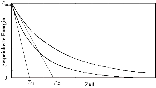 Der Speicher- und der Zykluswirkungsgrad eignen sich daher nicht als zyklusunabhängige Vergleichsgrößen für die Speichergüte einer Anlage. Das nächste Bild zeigt qualitativ die Abnahme des Energieinhaltes von zwei unterschiedlichen Schwungrädern, nachdem die äußere Energiezufuhr eingestellt worden ist.
