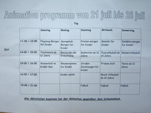 Seit 2006 gibt es im Sommer ein Animationsprogramm für Kinder. Dieses ist nicht so umfangreich wie ein All-inclusive im Süden, aber z.B. unsere Kinder nehmen gerne daran teil (2-3 Stunden pro Tag).