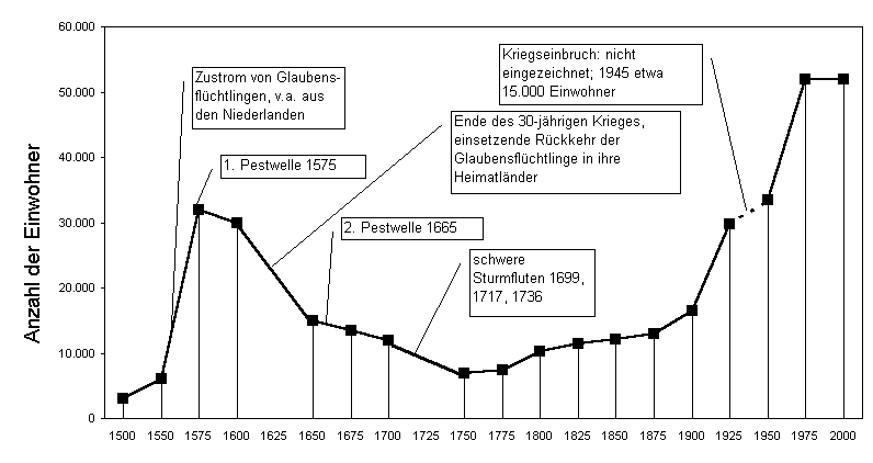 In Anlehnung an die Geschichte Emdens wird im Folgenden die Entwicklung der Einwohnerzahlen graphisch dargestellt. Ursachen für Einbrüche bzw. Zunahme der Einwohnerzahlen können auf meiner Website nachgelesen werden. Da mir nicht für jedes Jahr Angaben zur Einwohnerzahl Emdens vorlagen, wurden die Zahlen der betreffenden Jahre durch lineare Interpolation (zwischen den Vor- und Folgejahren) bestimmt. Dadurch sind kurzfristige Änderungen der Einwohnerzahl nicht zu erkennen. So ist beispielsweise der Rückgang während des Zweiten Weltkrieges nicht dargestellt.